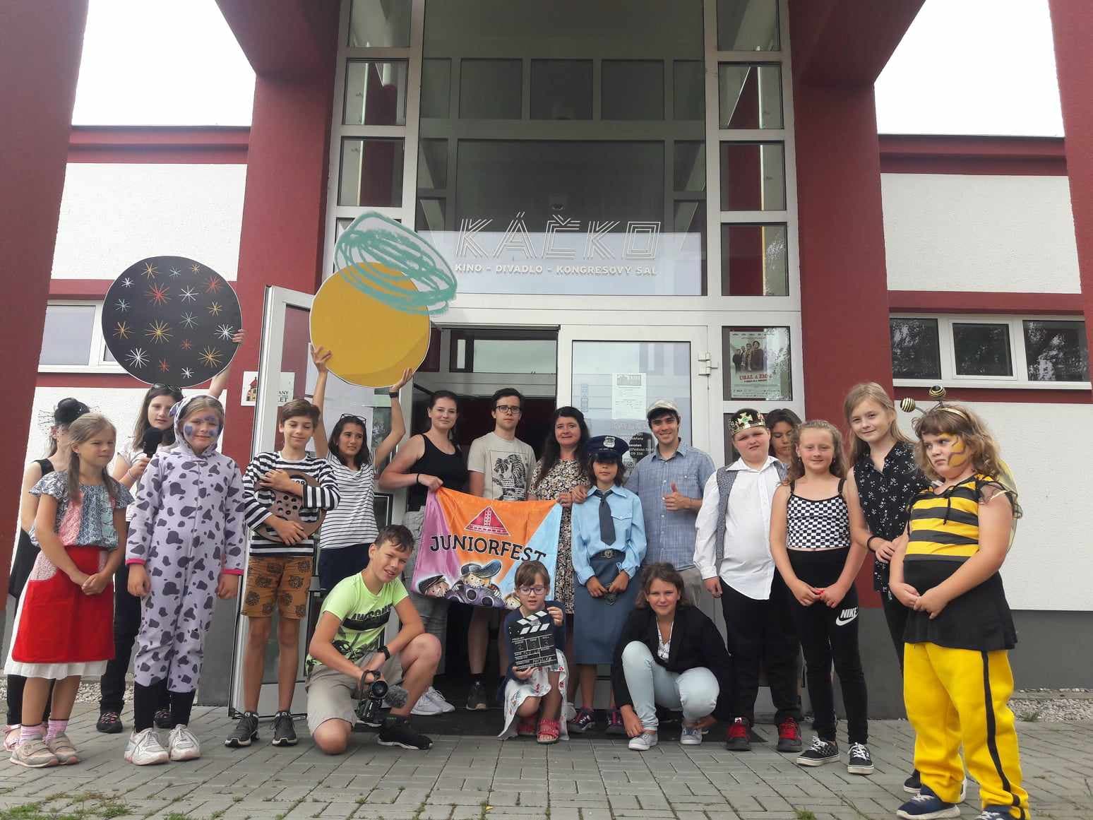 Posilněni tradičně chutným obědem jsme se vrátili do kina, kam kolem 14:30 dorazil Antonín, a zde se děti připravovaly na slavnostní projekci. Mezitím co si Šárka s Kačkou, coby moderátorky, připravovaly dramaturgii programu a ostatní vytvářely a umisťovaly na sedačky jmenovky pro čestné hosty (mj. své rodiče, Juditu, M. Šaška i filmové lektory), já si s provozní kina (L. Šaškovou) vyzkoušel film odpromítat nanečisto. V 15:20 začaly chodit první hosté. Šárka s Kačkou za čtvrt hodiny zahájily program přivítáním publika, Šárka zahrála sólo na saxofon a ostatní jsme v hledišti v napětí čekali, jak bude na velkém plátně film vypadat. Výsledný export filmu jsem totiž přede všemi záměrně tajil. Po konci titulků se sálem nesl velkolepý aplaus, za jehož průběhu moderátorky pozvaly všechny tvůrce na pódium. Před sálem, plným diváků v respirátorech, jsme jako filmoví lektoři měli s Antonínem možnost vznik filmu a dojmy z celého týdne okomentovat. Antonín mikrofon omítl, takže zůstalo na mě, abych za nás oba poděkoval a náš tvůrčí dobřanský tým moc pochválil. Podle vzoru oficiálních filmových premiér nadešel prostor na dotazy diváků. Na všechny jsme s radostí odpověděli, ještě jednou si vyslechli obrovský potlesk a přišla nejtěžší chvíle – uklízení a loučení. Jakmile se všechny rekvizity a kostýmy nanosily k holkám Vohradským do auta, tak jsme se všichni několikrát objali, mávali si a rozloučili se v naději, že se snad zase někdy setkáme.